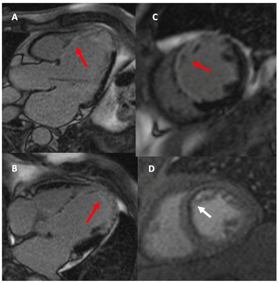 LGE sequences in the 3-chamber view (A), 4-chamber view (B), and short-axis view (C) demonstrate extensive transmural myocardial fibrosis in the territory of the left anterior descending artery (red arrow). The first-pass perfusion sequence in the short-axis view (D) shows subendocardial ischemia in the anterior wall and septum (white arrow).