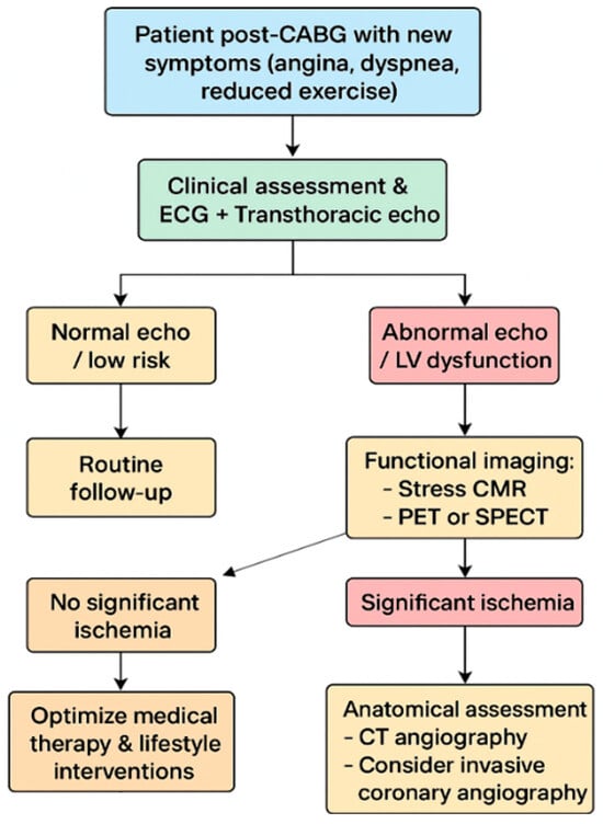 In contrast, in patients with new symptoms suggestive of CAD progression, multimodality imaging assumes a central role in establishing the diagnosis, defining prognosis, and guiding therapeutic interventions (Figure 5). Initial evaluation should always begin with clinical assessment, electrocardiography, and echocardiography to establish LV function and identify wall motion or valvular abnormalities [1,62]. In patients with intermediate pre-test probability of coronary disease progression, the choice between CCTA or functional imaging is irrelevant and can also be based on the center’s expertise. Conversely, in those with high pre-test probability, functional imaging with stress Echo, stress CMR, PET, or SPECT is the most informative next step. Stress CMR provides an integrated evaluation of perfusion, scar, and viability, helping to distinguish between ischemia in viable myocardium and fixed scar [43,44,45]. PET, particularly with tracers such as 18F-fluorodeoxyglucose, adds further value through quantitative perfusion and metabolic characterization, and can also assist in evaluating graft patency noninvasively [53,54,55]. SPECT, although offering lower spatial resolution compared with PET and CMR, remains widely available and cost-effective, thus representing a pragmatic choice in many centers [48,49]. CT angiography complements these techniques by providing high-resolution anatomical information on graft patency, stenosis, or occlusion and is especially useful when invasive angiography is not immediately indicated or feasible or to planning the best revascularization approach [63]. In symptomatic post-CABG patients with very high pre-test probability (>85%) of graft failure or coronary disease progression, current recommendations and clinical practice support direct referral to ICA as the initial diagnostic step, as it allows both definitive diagnosis and the opportunity for immediate intervention if feasible [1]. However, the choice of the appropriate imaging modality is often also guided by the availability and expertise of the individual center [64].