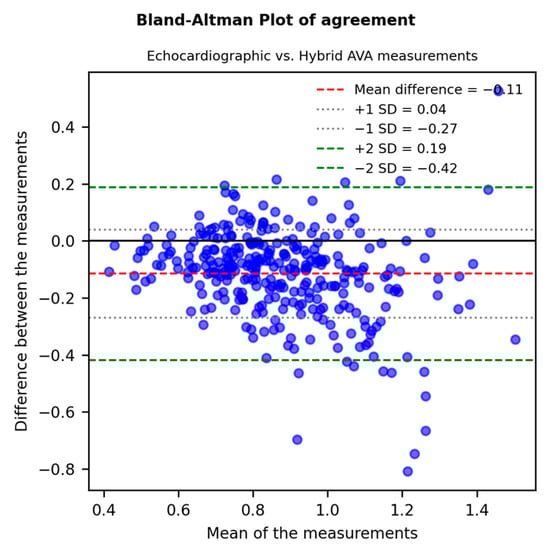 A Bland–Altman Plot (difference plot) assessing the agreement between echocardiographic and MDCT-derived “hybrid” AVA: echocardiographic AVA was significantly smaller with a mean difference of −0.11 ± 0.15 cm2 and a p-value < 0.001.