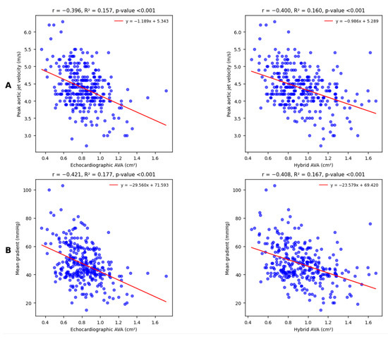Linear univariate regression analysis shows moderate and statistically significant correlations with peak aortic jet velocity (A) and mean transvalvular gradient (B) for both echocardiographic and hybrid AVA. The Williams test suggests that the observed differences between correlation coefficients are not relevant (respectively, p = 0.930 and p = 0.733).