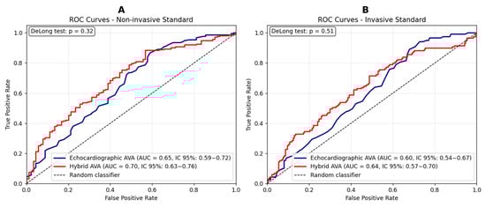The hybrid AVA, used as a diagnostic marker of AS severity, demonstrated an AUC similar to that of the gold standard (echocardiographic AVA), based on its agreement with both non-invasive (Figure 5A) and invasive (Figure 5B) reference measures.