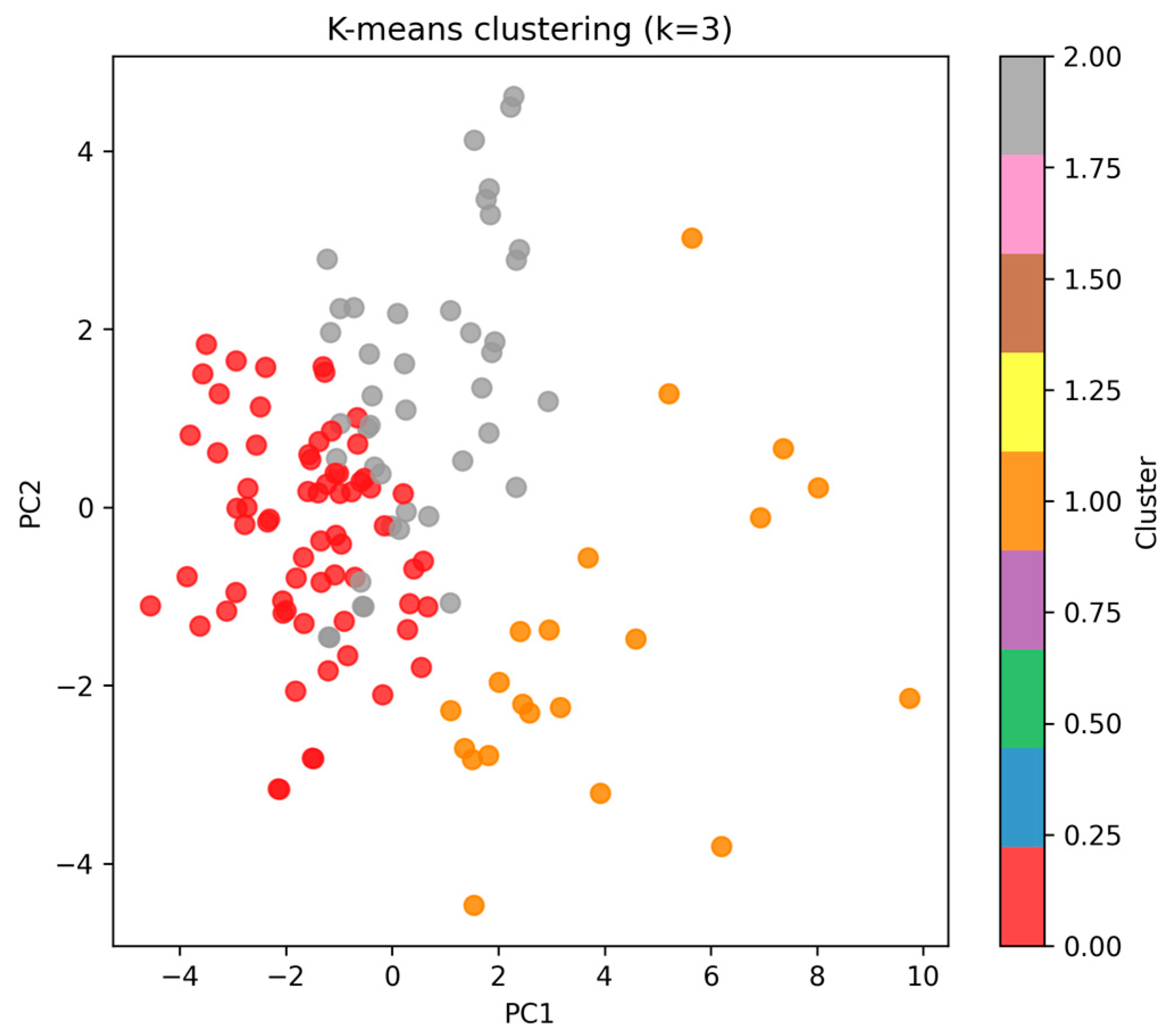 - K-means clustering was used to identify hidden adaptation profiles. The optimal number of clusters (k = 3) was determined through the elbow method and silhouette scores, indicating best separation and compactness at k = 3.