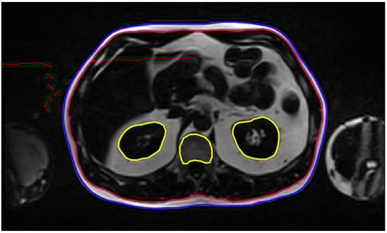 Each patient scan consisted of 80–100 MR slices, where 90.65 ± 10.81 slices were annotated on average (range 61–121 slices). The internal and external SAT contours for each slice were manually segmented, along with segmentations of highly metabolic organs such as the kidneys and spinal bone marrow. Manual segmentations were performed from the pelvic floor (L4–L5 interspace) to the diaphragm. The resulting ROIs included the external SAT abdominal contour (EXT; external SAT), the internal SAT abdominal contour (INT; internal SAT), and segmentations of the kidneys and spinal bone marrow, which were marked for exclusion (EXC; kidneys and spinal bone marrow) (Figure 1).