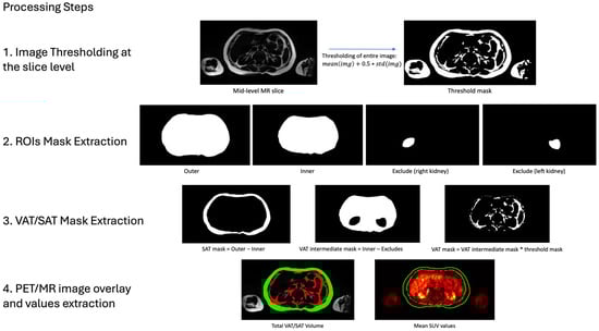 To evaluate metabolic activity, PET images were co-registered with structural MRI to facilitate the extraction of SUVmean from predefined regions of interest (SAT and VAT volumes). The co-registration process was simplified by the PET/MR imaging protocol, which enables simultaneous acquisition of inherently aligned images. Volumetric segmentations were subsequently used to extract and evaluate the accuracy of SUVmean values. SAT and VAT PET activity were quantified by resampling the respective ROI coordinates to PET resolution using nearest neighbor interpolation. Finally, slice-wise SUVmean values were computed and averaged across all slices to obtain global SAT and VAT SUVmean estimates.