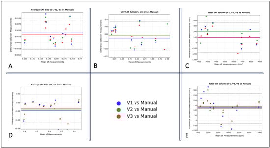 Bland–Altman plots comparing VAT and SAT volumetric and metabolic values derived from manual versus automated annotations across the three AI model versions: V1, V2, and V3 (n = 10). (A) Average SAT SUV (SUVmean). (B) VAT/SAT Volume Ratio. (C) Total SAT Volume (cm3). (D) Average VAT SUV (SUVmean). (E) Total VAT Volume (cm3).