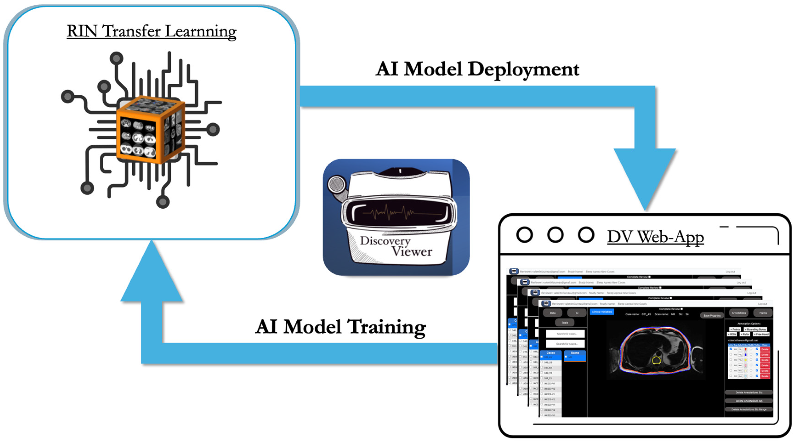 - Fauveau, V.; Sun, S.; Liu, Z.; Mei, X.; Grant, J.; Sullivan, M.; Greenspan, H.; Feng, L.; Fayad, Z.A. Discovery Viewer (DV): Web-Based Medical AI Model Development Platform and Deployment Hub. Bioengineering 2023, 10, 1396. [Google Scholar] [CrossRef]