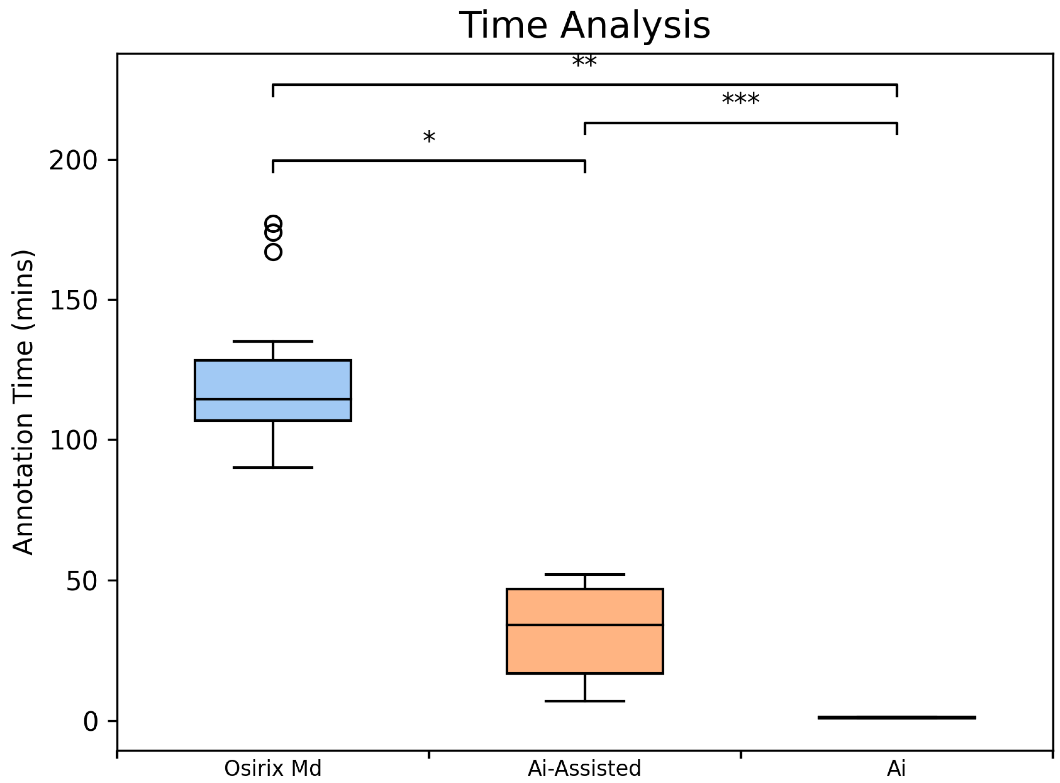 | Outcome | Manual vs. AI Model Outcome Values | Intraclass Correlation Coefficient (ICC) | |||||