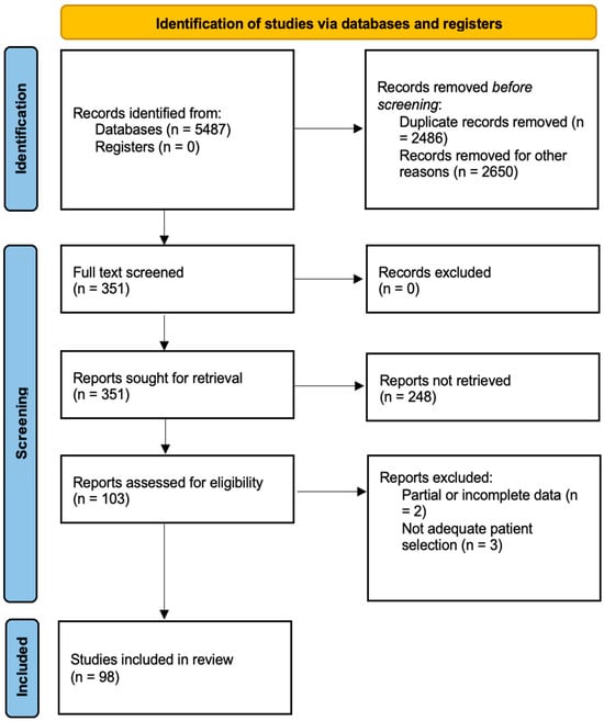 The studies were selected based on the following inclusion criteria: articles published in English, studies that specifically addressed the use of imaging tools in OSA, research including human subjects with a diagnosis of OSA, articles that provided clear methodological details and reported on imaging outcomes, and studies that included both adult and pediatric populations. The exclusion criteria were studies that did not focus on imaging modalities, case reports, editorials, and commentaries, and research with inconclusive or incomplete data. From an initial review of 5487 abstracts, 5136 were excluded based on relevance and adherence to the inclusion criteria. A total of 351 full-text articles were assessed, of which 98 were ultimately included in this review (Figure 1).