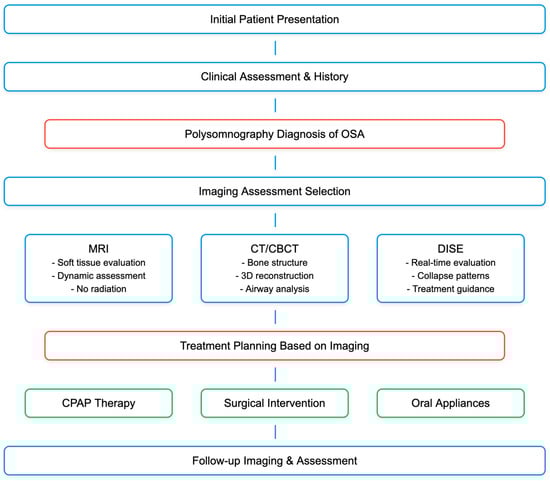 Imaging is a critical tool in the selection of surgical candidates for OSA treatment. It provides detailed anatomical information that can help predict which patients are likely to benefit from surgery and which specific surgical procedures may be most effective. Imaging can reveal the size, shape, and position of the jaw, tongue, tonsils, and other structures that may contribute to airway obstruction. This helps in identifying patients whose anatomy is amenable to surgical correction [12,45]. Techniques like CT scans and MRI can help visualize the entire airway in three dimensions, which is essential for planning surgeries such as maxillomandibular advancement or tracheostomy [46,47]. Moreover, some advanced imaging techniques allow for virtual surgery simulations to predict the outcome of certain surgical procedures, thus aiding in the decision-making process [48,49].