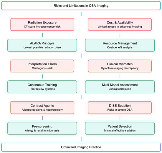 While imaging is a valuable tool in the diagnosis and management of OSA, there are potential risks and limitations to consider. Modalities such as CT scans expose patients to ionizing radiation, which can increase the risk of cancer over time [62]. To mitigate this, clinicians should adhere to the “as low as reasonably achievable” (ALARA) principle, using the lowest possible radiation dose to achieve the necessary diagnostic information [63,64]. Advanced imaging techniques can be expensive and not readily available in all healthcare settings. Cost–benefit analyses and consideration of healthcare resources are essential to ensure that imaging is used judiciously. Imaging requires an accurate interpretation by experienced radiologists or sleep specialists. Misinterpretation can lead to incorrect diagnoses or inappropriate treatment plans. Continuous training and peer review can help reduce the risk of errors. Imaging may sometimes suggest the presence or absence of an abnormality that does not correlate with the patient’s clinical symptoms, leading to unnecessary treatments or missed diagnoses. Correlating imaging findings with clinical evaluation and other diagnostic tests can help minimize these issues [25,65,66,67]. Some imaging studies require contrast agents, which can cause allergic reactions or nephrotoxicity [68,69]. Pre-screening for allergies and renal function assessment can help mitigate these risks. Procedures like DISE require sedation, which carries its own risks, particularly in patients with severe OSA [70,71]. Proper patient selection, monitoring, and the use of the lowest effective sedation dose can help reduce these risks (Figure 3).