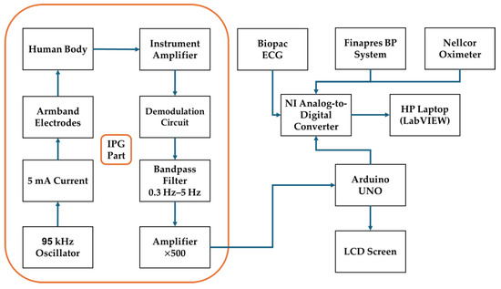 Measurements were collected before and after exercise for each participant, capturing data from the IPG system, BIOPAC ECG, the Nellcor oximeter, and the Finapres® NOVA system. Each device recorded analog signals at a sampling rate of 256 Hz, which were digitized using a National Instruments NI-USB-6128 analog-to-digital converter and stored on an HP ProBook laptop. Data acquisition was managed using LabVIEW 2024 (National Instruments, Austin, TX, USA), with subsequent offline analysis conducted in MATLAB R2022b (MathWorks, Natick, MA, USA).