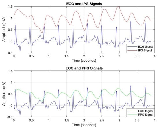 The data analysis commenced with the processing of IPG, ECG, and PPG signals, sampled at a rate of 256 Hz, as depicted in Figure 4. This sampling rate was selected to ensure accurate calculation of Pulse Transit Time (PTT), as outlined in the methodology section. Data acquisition was conducted under both resting and post-exercise conditions to introduce controlled variability in cardiovascular responses, thereby enhancing the robustness of the analysis.