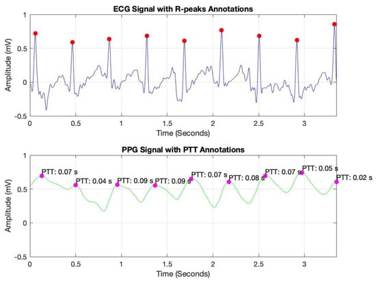 To optimize signal quality, a bandpass filter was applied to each signal, isolating the relevant frequency ranges associated with cardiovascular dynamics. This filtering process effectively attenuated noise and extraneous frequencies, thereby improving the clarity and reliability of the data for subsequent PTT calculations. In Figure 5, peak detection was conducted using MATLAB’s findpeaks command, identifying R-peaks in the ECG signal (marked with red dots) and corresponding peaks in the PPG signal (marked with magenta dots). By measuring the time interval between these peaks, we derived the PTT values, which are essential for non-invasive blood pressure estimation.