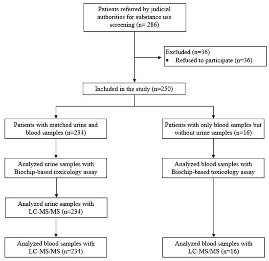 This study is a single-center-based study conducted at the Forensic Toxicology Laboratory, Department of Forensic Medicine, Gaziantep University in October 2020. This study included volunteers, and written informed consent was obtained. Research regarding the human subjects was conducted in compliance with the Declaration of Helsinki. Inclusion criteria were as follows: (1) being 18 years of age or over, and (2) being referred to the Department of Forensic Medicine for drug use screening. Those who did not agree to participate in the study were excluded from the study. Two hundred eighty-six subjects were referred to the Forensic Toxicology Laboratory, Department of Forensic Medicine, Gaziantep University, by legal authorities in order to detect narcotics use. Blood and/or urine samples from 250 subjects were collected consecutively (Figure 1). The samples included in the study were (a) both blood and urine samples from 234 subjects and (b) only blood samples from 16 subjects.
