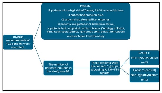 A total of 102 patients who underwent thymus imaging and had their data recorded were initially included in the study, considering the previously mentioned exclusion criteria. However, 16 of these patients were excluded from the study for the following reasons: six patients had a high risk of trisomy 13–18 based on a double test, one patient had pre-eclampsia, two patients had elevated liver enzymes, three patients were diagnosed with gestational diabetes mellitus, and four patients had congenital cardiac diseases (Tetralogy of Fallot, ventricular septal defect, right aortic arch, and aortic interruption). Consequently, data from 86 patients were analyzed (Figure 1).