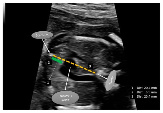During the ultrasonographic assessment, the patient was placed in the supine position on the examination table. This was measured when the fetus was inactive. The thymus–thorax ratio (TTR) was determined by measuring the thymic and thoracic diameters perpendicular to the line connecting the centers of the sternum and the thoracic spine [] (Figure 2). The anteroposterior diameter of the fetal thymus was measured along the midline, extending from the posterior border of the sternum to the anterior border of the transverse aortic arch. Similarly, the anteroposterior mediastinal diameter of the thorax was measured along the same line, extending from the posterior border of the sternum to the anterior border of the thoracic spine. Additionally, the left brachiocephalic vein (LBCV), located in a different plane, can serve as an additional anatomical landmark to define the posterior border of the thymus. In previous studies, the intrathymic course of the LBCV has been associated with congenital heart diseases (CHDs), and therefore, special attention was given to this structure []. The TTR was calculated as the ratio of the anteroposterior thymic diameter to the anteroposterior mediastinal thoracic diameter [,,] (Figure 2). These measurements had no impact on the patient’s follow-up or treatment.