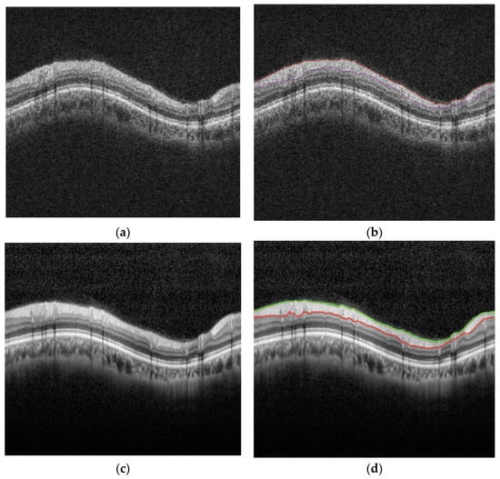 Four types of image datasets. (a) A-raw; (b) A-curve; (c) B-raw; (d) B-curve. The colored lines are the manual segmentation lines by clinical experts.