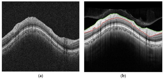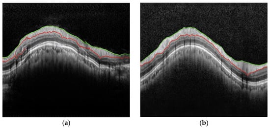 Images of A-raw and B-curve. (a) A-raw; (b) B-curve. The colored lines are the manual segmentation lines by clinical experts.