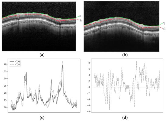 Let the function represent the relative thickness of RNFL, calculated based on the horizontal pixel positions in the OCT image. This function takes an image with corresponding segmentation lines and computes the width between the upper and lower segmentation lines at each horizontal pixel, returning a vector of length equal to the image’s width. That is, , where and are the upper and lower segmentation lines, respectively.