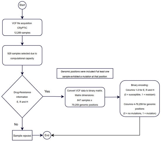 The original VCF file contained mutation data for each isolate; however, its structure was not optimal for efficiently creating a training matrix. To address this issue and ensure computational feasibility, a preprocessing step was performed, which involved extracting a subset of 929 unique IDs from the original dataset of 12,289 isolates. This subset was selected as the maximum number of samples that could be processed within the available computational resources. While the selection was not based on specific sampling criteria, it aimed to maintain a balance that reasonably represented the diversity and variability of the original dataset.
