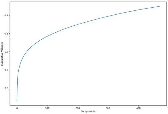 Principal component analysis (PCA) was employed as an optimal transformation method for dimensionality reduction, minimizing squared errors. PCA focuses on identifying the features with the greatest variance and retaining the lower-order principal components that are most relevant to the dataset. In this study, 470 principal components were retained, representing 95% of the cumulative variance in the dataset (