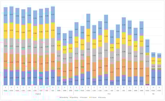 Figure 4). Models trained on the original dataset consistently outperformed those trained on a dataset reduced by principal component analysis (PCA), indicating better classification accuracy without dimensionality reduction.
