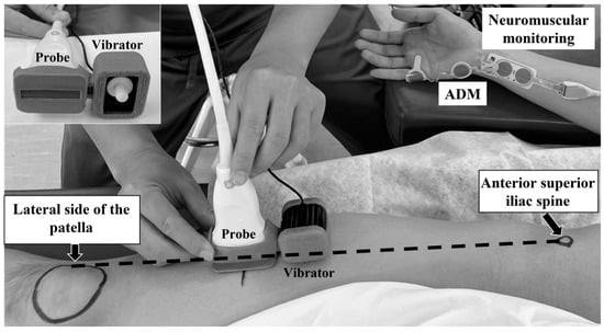 23], the measurement point was determined by marking two-thirds of the distance along the line from the anterior superior iliac spine to the lateral side of the patella. The probe of the ultrasound diagnostic device was positioned parallel to the long axis of the muscle fibers directly over this measurement point, with the excitation point of the vibrator being placed proximal to the probe (