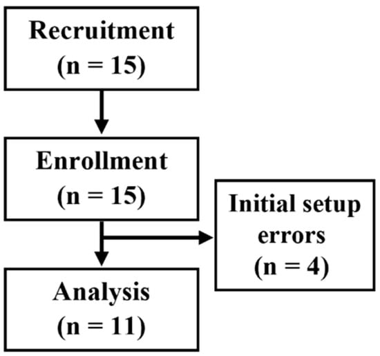 Fifteen patients who met the inclusion criteria were enrolled in this study. However, four patients were excluded from the analysis because of initial setup errors during the measurement. Initial setup errors refer to issues such as the predefined ROI for Doppler images not matching the depth of the target muscle. Although adjustments to the ROI were attempted during measurement, this deviation from the software’s constraints rendered the analysis unusable. Consequently, data from 11 patients were included in the final analysis (