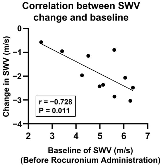 Table 2) The change in the SWV was significantly negatively correlated with the SWV before rocuronium administration, supporting the hypothesis that reduced muscle elasticity, as indicated by the SWV, corresponds to a decreased SWV (r = −0.728,