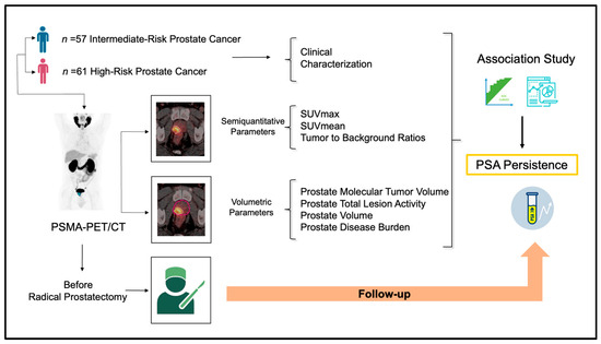 The aim of this study was to investigate classical and volumetric parameters of PSMA-PET in the prostate gland in patients with intermediate- and high-risk PC at initial staging before RP, and their possible association with PSA persistence.