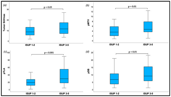Boxplots displaying differences in PSMA-PET metrics in patients with ISUP Grade 1–2 and patients with ISUP Grade 3–5. (a) Tumor SUVmax (median: 8.8 vs. 11.6, p = 0.03); (b) pMTV (median: 3.6 vs. 4.7, p = 0.01); (c) pTLA (median: 19.2 vs. 29.4, p < 0.001); (d) pDB (median: 6.8 vs. 9.2, p = 0.01).