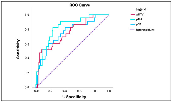 The usefulness of employing the PSMA-PET metrics (pMTV, pTLA, and pDB) before surgery to discriminate patients who had a PSA persistence after RP was established by means of ROC curves. The corresponding ROC curve plots are displayed in Figure 4. The significant cut-off points for the curves had the following values: 4.7 cc for pMTV, 25.1 for pTLA, and 9.1% for pDB. Table 4 shows the rest of the diagnostic indices from ROC analysis for each parameter.