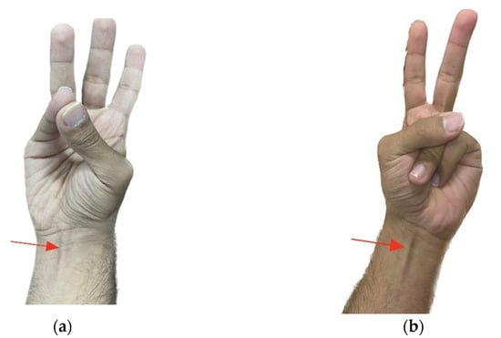 - Pushpakumar, S.B.; Hanson, R.P.; Carroll, S. The ‘Two Finger’ Sign. Clinical Examination of Palmaris Longus (PL) Tendon. Br. J. Plast. Surg. 2004, 57, 184–185. [Google Scholar] [CrossRef]