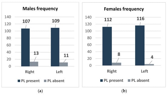 Figure 3a,b depict the prevalence of the PL across different hands and genders. Regarding the females, presence of the PL was noted in 112 right hands and 116 left hands, with a slightly higher prevalence in the left hand, whereas it was absent in 8 right hands and only 4 left hands, indicating a strong presence with minimal absence. In contrast, males displayed a PL in 107 right hands and 109 left hands, with a slightly increased frequency in the left hand. However, the absence was more pronounced among males, with 13 right hands and 11 left hands lacking a PL. Overall, the data indicate that both males and females had a higher PL prevalence in the left hand, with females showing a greater overall presence and fewer absences of a PL than males.