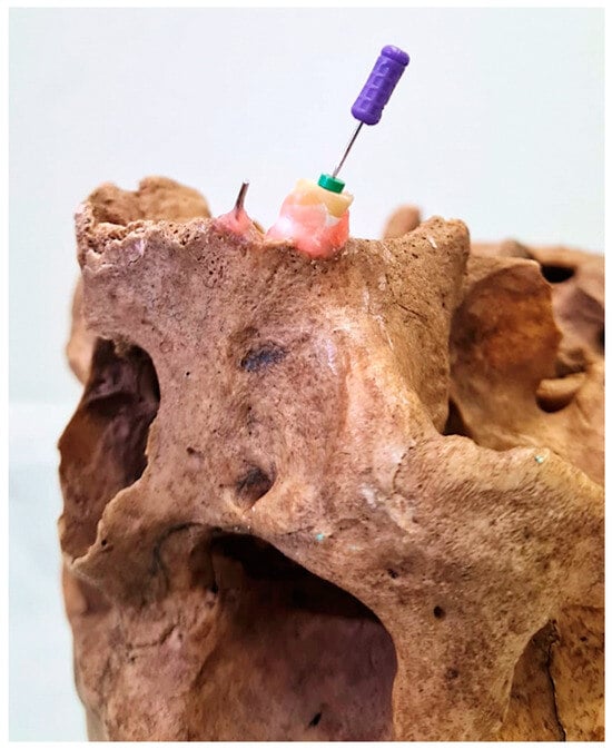 Prior to the study, 40 permanent, single-rooted, extracted human premolar teeth were collected. The teeth that had been extracted due to periodontal or orthodontic considerations underwent meticulous cleaning procedures. Disinfection and cleaning were performed with 2% glutaraldehyde for 2 h, and the teeth were kept hydrated in water, as previously described [19,20]. A superficial root scaling procedure was used to remove residual tissue and establish a uniform root surface. The exclusion criteria consisted of teeth with root canal treatment, calcification, incomplete root formation, resorptive lesions, or fractures. The teeth were analyzed under an operation microscope (Carl Zeiss AG, Jena, Germany), and teeth with any fractures/cracks, internal/external root resorption, calcification, root canal filling, incomplete root formation, or severe curvature (exceeding 15° based on the Schneider method [21]) were excluded from this study. Teeth whose root lengths were outside the range of 14–17 mm were excluded from the study.