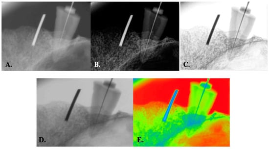 The files were subsequently reintroduced into the root canals at the recently determined length and firmly affixed via wax. The roots of the sample teeth were encased with Teflon tape, with three turns applied to represent the periodontal space on the X-ray accurately. Afterward, to mimic clinical scenarios, the samples were placed in the appropriate socket on the maxilla of a dry human skull. A circular orthodontic wire 10 mm in diameter was inserted into the neighboring dental socket and fixed using wax to eliminate radiography magnification (Figure 1). To ensure that all samples were captured under consistent geometric conditions and achieve parallelism during radiographic imaging, the digital RVG 5200 sensor (Carestream Dental, Atlanta, GA, USA) was securely affixed to the palatal side of the sockets in the maxilla. Owing to the palatal curvature of the dry maxilla we used and the necessity to achieve superimposition of the maxillary sinus and zygomatic bone with the root of the upper premolar, a film holder could not be placed; however, to serve the same purpose, the sensor was covered with wax from behind and fixed palatally in the determined position. The source-to-object distance was standardized as 30 cm. An intraoral X-ray unit (New Life Radiology Timer X3000-2C, S.R.L., Grugliasco, Italy) operating at 60 kV, 7 mA, and 0.03 s was used. Following the X-ray procedure for each tooth sample, the KODAK Dental Imaging Software version 6.12.32.0 program (Eastman. Kodak Co., Rochester, NY, USA) was configured to operate in five distinct image modules (Figure 2): A. original module (O), B. autoenhancement module (E), C. autoenhancement+negative module (E–N), D. negative module (N), E. colored module (C). As a result, 200 images were acquired for evaluation by applying five different image modules to 40 teeth. These image modules refer to the system’s built-in components within the software, which, when applied, automatically convert the image to the respective module. The resulting versions of the images were subsequently stored as TIFF files in 5 different image modules.