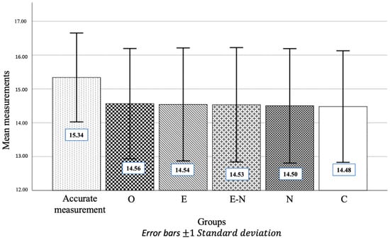 In this study, X-ray measurements were conducted by three observers via five different image modules. Interobserver agreement was assessed via the interclass correlation, which revealed a very high level of agreement. Additionally, the intraclass correlation coefficient showed excellent intraobserver agreement for all image modules, with means higher than 0.98. The descriptive statistics are presented in Table 1. An illustration of the average values of the measurements for each group is shown in Figure 3.