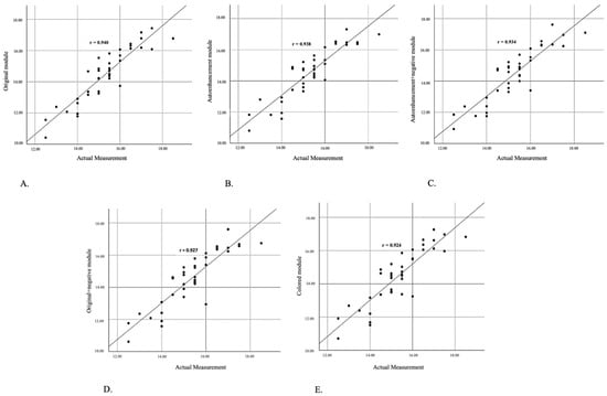 The scatter plot graph illustrates the linear relationship between actual measurements and measurements in the original (A), autoenhancement (B), autoenhancement+negative (C), original+negative (D), and colored (E) modules.