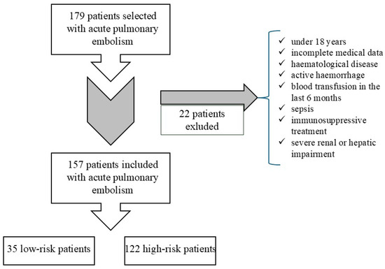 We included 179 patients hospitalized for acute PE between January 2020 and August 2023 in the Cardiology Department of “Sf. Spiridon” Hospital, Iasi. The inclusion criteria were age ≥ 18 years old, confirmed diagnosis of acute PE, complete medical data and patient consent. Twenty-two patients were excluded from the study according to the exclusion criteria, as shown in Figure 2. A total of 157 patients were finally included in the study (Figure 2). The clinical manifestations of patients varied; most of them had dyspnea. Unfortunately, the exact time between the onset of symptoms and the presentation time cannot be quantified because most patients presented when their symptoms worsened and not when they started.