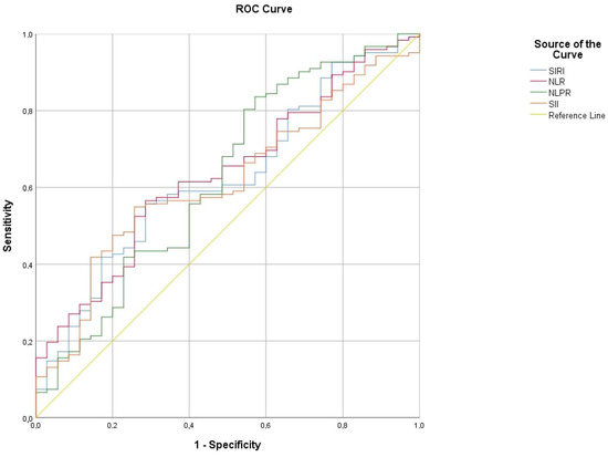 Based on receiver–operating characteristic curve (ROC) analysis, the NLR, NLPR, SII and SIRI cut-off value of admission for prediction of a high sPESI score was determined as 4.32, 0.011, 1086.55 and 2.87, respectively, with a sensitivity of 57.4%, 81.1%, 55.7% and 59%, respectively, and specificity of 65.7%, 42.9%, 71.4% and 62.9%, respectively (Table 7 and Figure 3).