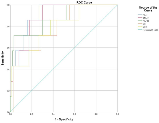 ROC curve indicating sensitivity and specificity of NLR, d-NLR, NLPR, SII and SIRI to predict in-hospital mortality in acute PE.