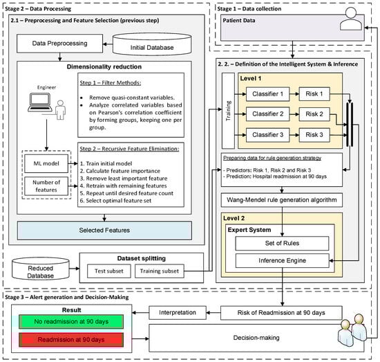 - Stage 2.2 - Definition of the intelligent system and inference: Once the variables with the highest predictive power have been selected, they are processed by the system. To do this, as mentioned, a two-level system is deployed. At the first level, three machine learning algorithms are presented that run concurrently, and to which the twelve patient variables are provided. More specifically, three machine learning algorithms have been selected following Peter Flach’s recommendations [58]: Random Forest, Naïve Bayes, and Multilayer Perceptron. At the output of each of these, a risk indicator is obtained, the risks R1, R2, and R3. After that, at the second level, a fuzzy expert system of the Mamdani type is deployed [59,60,61,62], which allows the risks obtained at the first level to be added and grouped, obtaining the Risk of Readmission at 90 days. In general, one of the most complex tasks in the design and development of an expert system is the definition of its knowledge base. For this reason, in this work, the use of the Wang–Mendel automatic rule generation algorithm [63,64] has been chosen so that, starting from a new dataset formed by risks R1, R2, and R3 obtained for each patient in the training dataset, it is possible to generate the knowledge base of the expert system. The test set was not used under any circumstances to determine the knowledge base of the expert system. It was exclusively reserved for the model’s subsequent evaluation. Once the system architecture has been defined and given the data of a new patient, it is possible to carry out its analysis, obtaining the associated Risk of Readmission at 90 days.