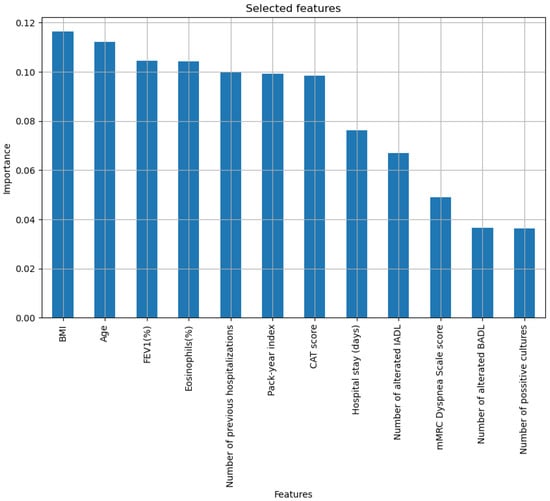 - Recursive Feature Elimination: The Recursive Feature Elimination (RFE) method [56,57] is used, using a Random Forest model. RFE method can be categorized as a hybrid method since it considers characteristics of both wrapper and embedded methods [56]. RFE, in essence, allows selecting an optimal subset of features iteratively, eliminating the least important ones, and retraining the model until reaching the desired set. After performing various tests, a final set with 12 predictive variables was determined, including age, body mass index (BMI), pack-year index (PYI), % FEV1, %Eosinophils, CAT score, number of positive cultures, number of hospitalizations in the previous year, days of stay, dyspnea according to the mMRC scale, number of basic activities with dependence and number of instrumental activities with dependence.