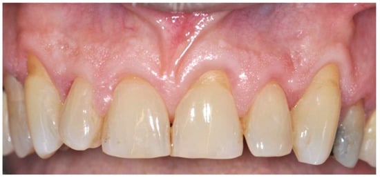 The intraoral clinical examination documented the “restitutio ad integrum” of the gingival tissues with full restoration of volume, thickness, and shape of the gingiva with normal marginal festooning and no evidence or signs of inflammation (Figure 3).