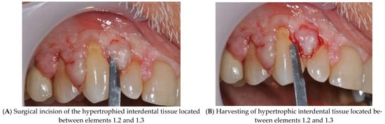 Surgical excision of hypertrophic interdental gingival tissue between elements 1.2 and 1.3: surgical incision (A) and tissue removal (B).