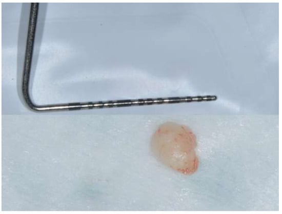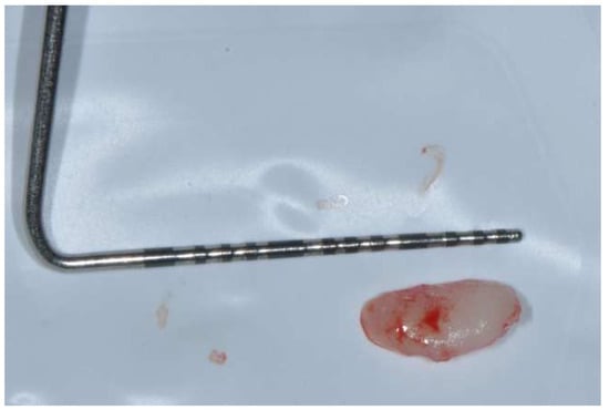 Two specimens of gingival tissue, one approximately 4 mm long (Figure 6) and the second 8 mm long (Figure 7), were fixed in saline-buffered formaline and sent to the pathologist to perform the histopathological evaluation and confirm the diagnosis.