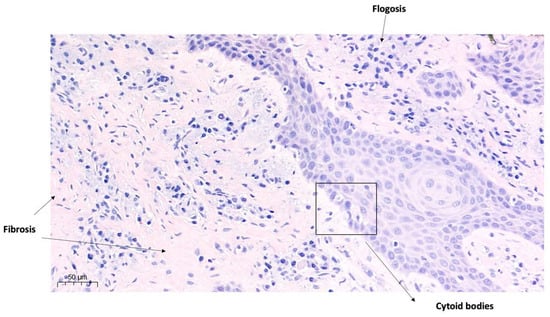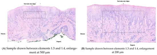 Histological analysis of tissue samples taken between elements 1.3 and 1.4, showing fibrosis, flogosis, and test-tube rete ridges. (A) Enlargement at 500 µm; (B) Enlargement at 200 µm.