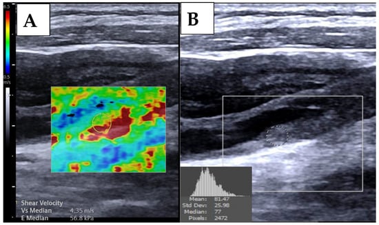 Measurements of ultrasound 2D-SWE (A) and grayscale median (B) from the carotid plaque.