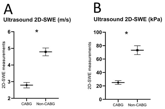 Ultrasound 2D-SWE of carotid plaques in m/s (A) and kPa (B) (mean ± SEM). * p ≤ 0.05 using Mann–Whitney U between carotid plaques from CABG and non-CABG control patient groups.