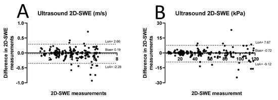 Bland–Altman inter-observer agreement of carotid plaque 2D-SWE in m/s (A) and kPa (B) measurements. LOA = limit of agreement.